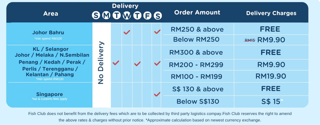 My purchase from Fish Club saves a lot of my time and the fish is very fresh and tasty. My baby loves it very much. Of course it it still advisable to check for bones, but so far no bones found. I recommend Fish Club to busy mum like me.